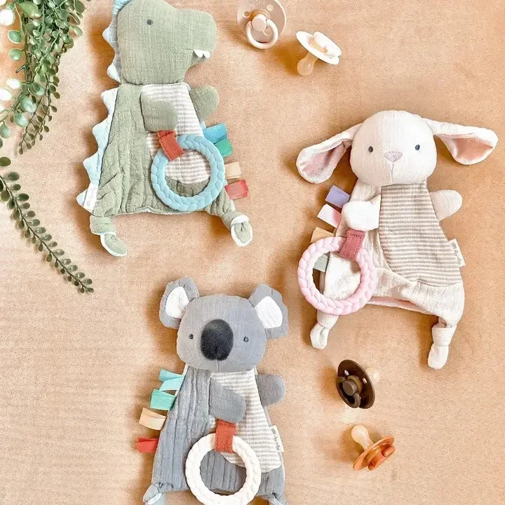 With features like soft natural cotton fabric, textured ribbons and a braided teether, baby will love to explore this new friend.