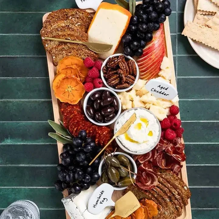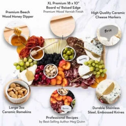 - Premium 18 x 10” Board: This XL rubber wood cheese board features raised edges and an easy-to-clean, varnish finish; making post-party cleanup a breeze.