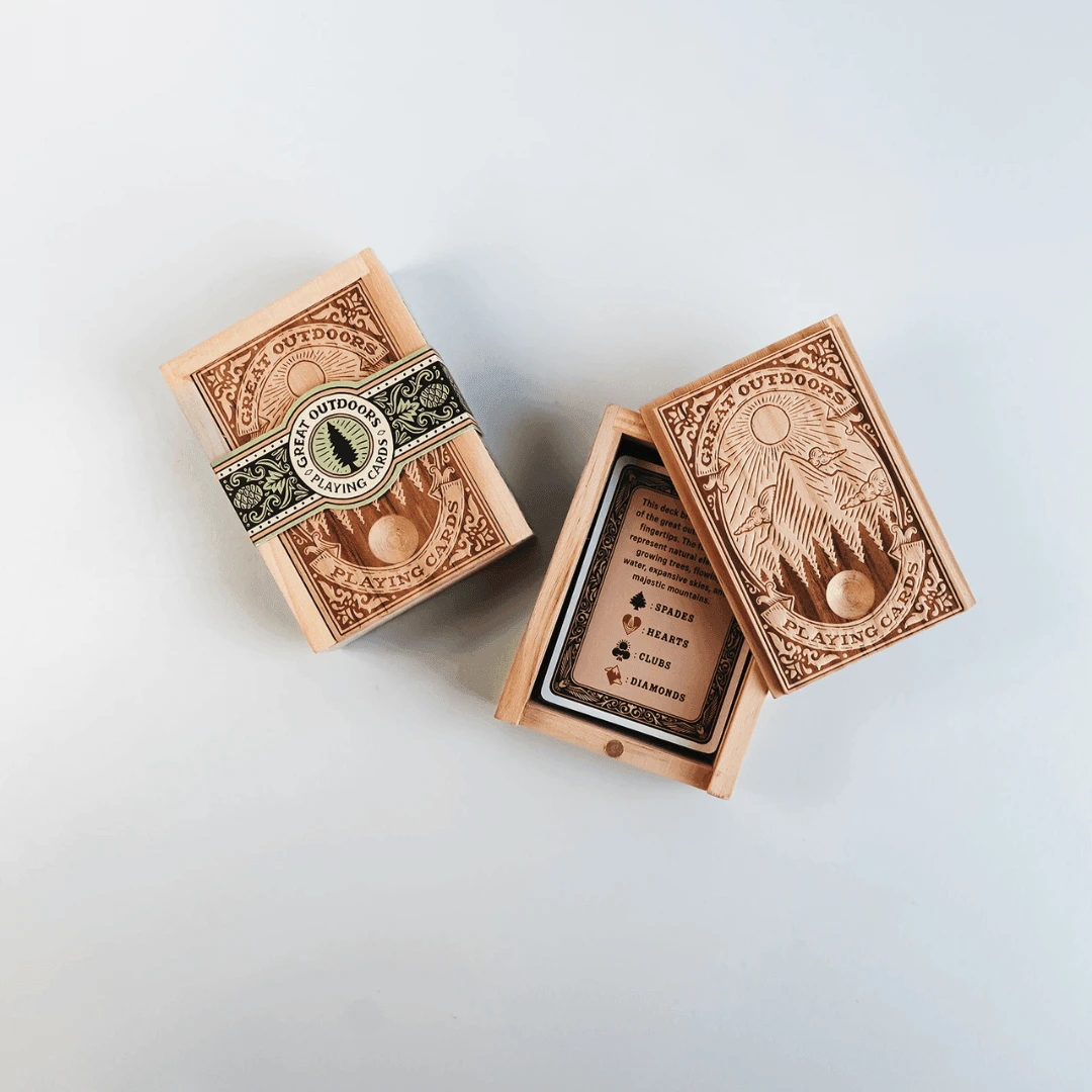 Housed in a responsibly sourced wooden box that is handsome enough to leave on the tabletop and light enough to take on-the-go, this set will delight outdoor enthusiasts, art lovers, and card players alike.