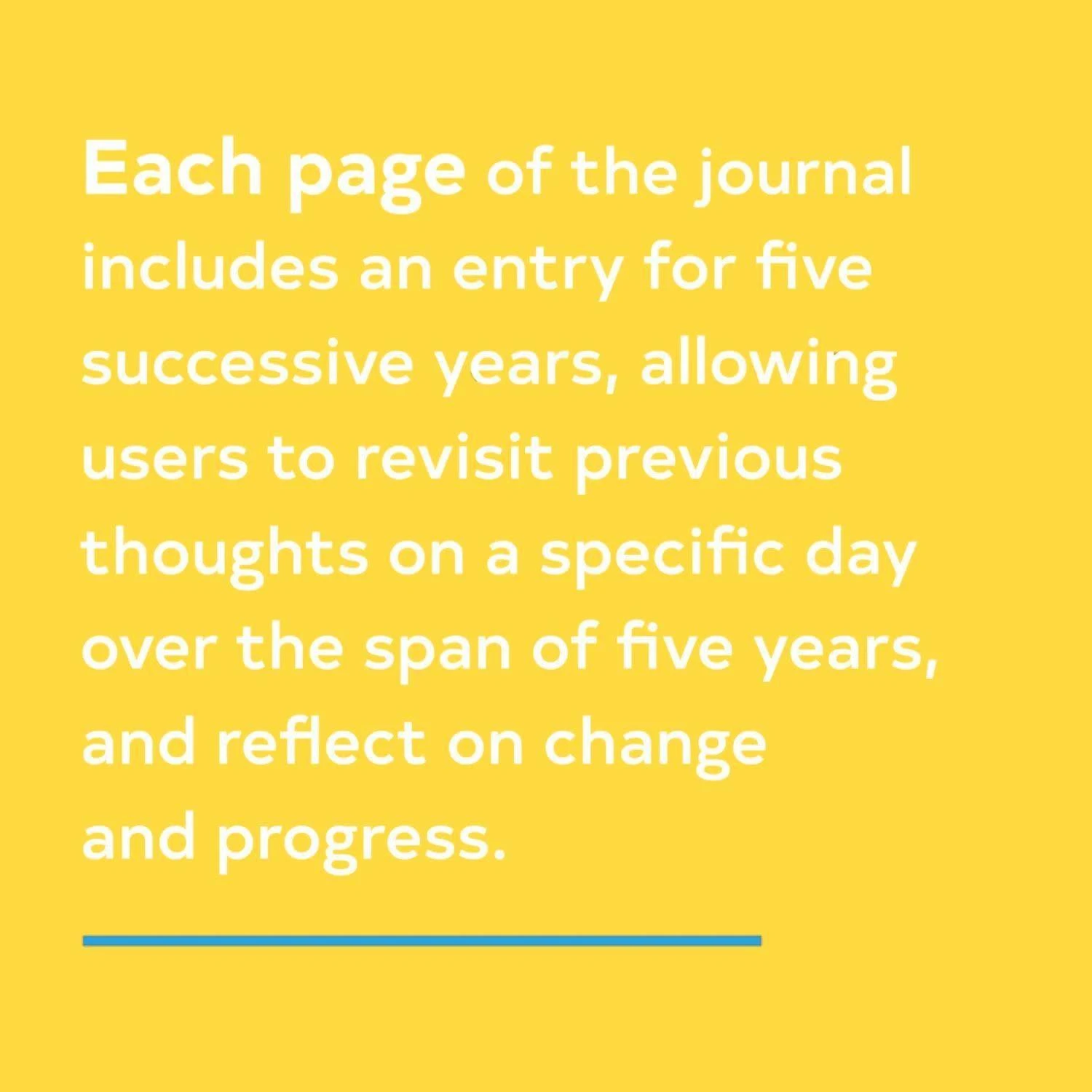 Daily entries are small but profound motivations to stay committed, and the five year format will enable users to observe growth and positive change over the course of time..