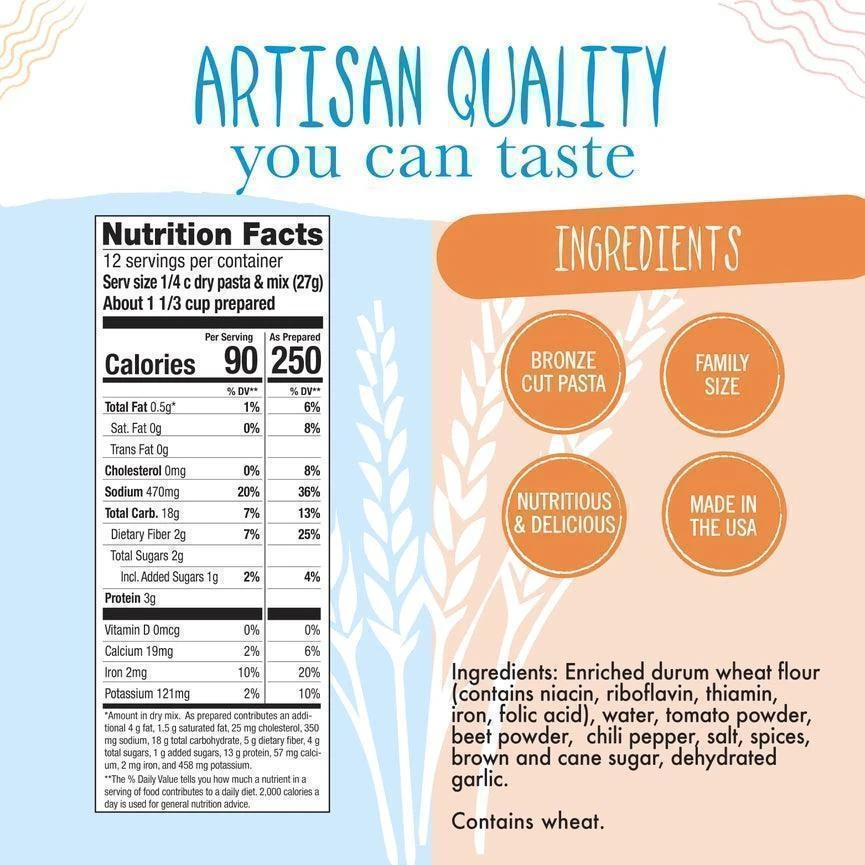 Spice level is mild-medium and serves 6-8. A 11.25 oz bag of pasta with chili mix included!