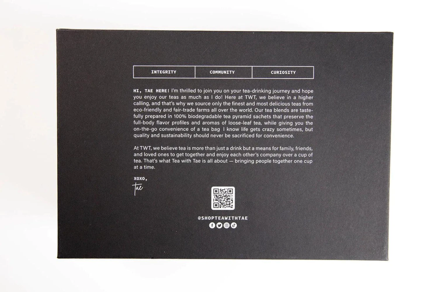 Tea with Tae is a woman-owned tea company offering premium teas sourced from some of the most exquisite and finest tea farms in the world. Our tea is served in eco-friendly tea sachets to preserve the sophisticated flavor profiles and aromas of each tea, while maintaining the convenience of a tea bag. It’s the best of both worlds, especially for those who are constantly on the move and hustling everyday!