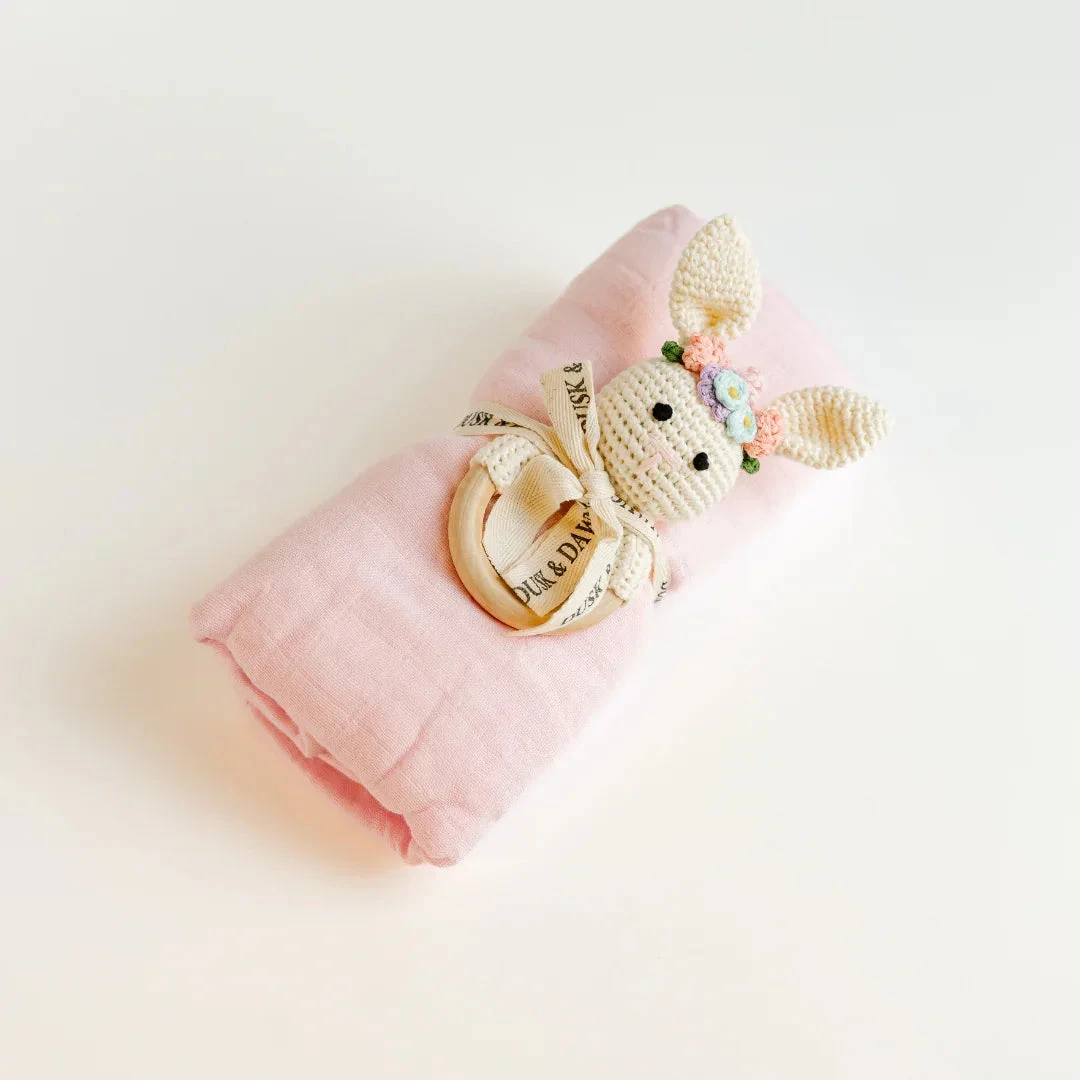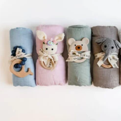 They include a buttery-soft muslin swaddle—perfect for snuggles, naps, and on-the-go comfort—paired with a safe, soothing teether to help ease teething discomfort.