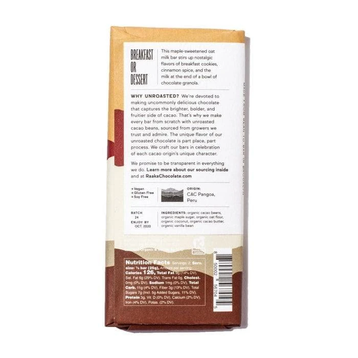 This maple-sweetened vegan chocolate bar reminds us of homemade granola covered in chocolate; it could be breakfast, but it could also be dessert. Cane sugar-free and dairy free. We’ve made it with Peruvian cacao, oats, pure maple sugar, toasted coconut, and a dash of vanilla bean.