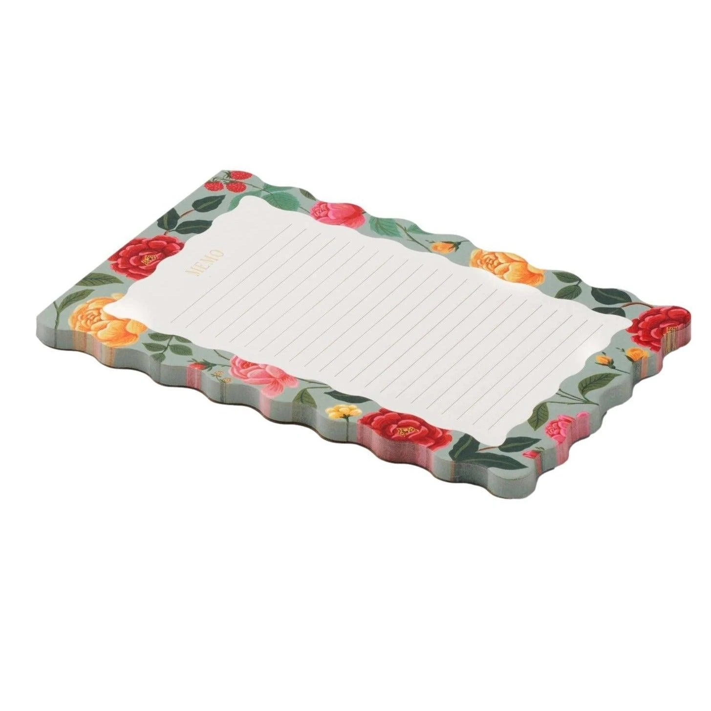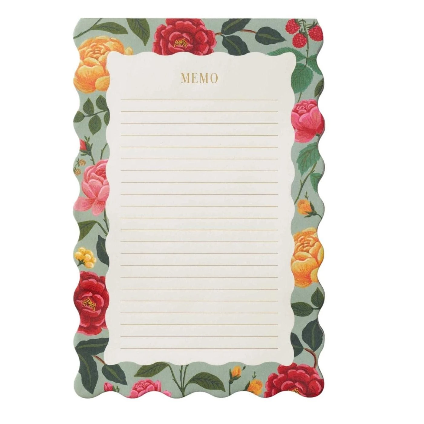 Blooming roses and a scalloped edge decorate this oversized notepad, which features 65 tear-off sheets and gold foil on every page.