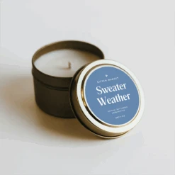 Our Sweater Weather Gold Travel Candle is a magical blend of plum berries,ginger crystallized in sugar, dusted with warm cinnamon and cardamom, and finished with a comforting spiced amber dry down.