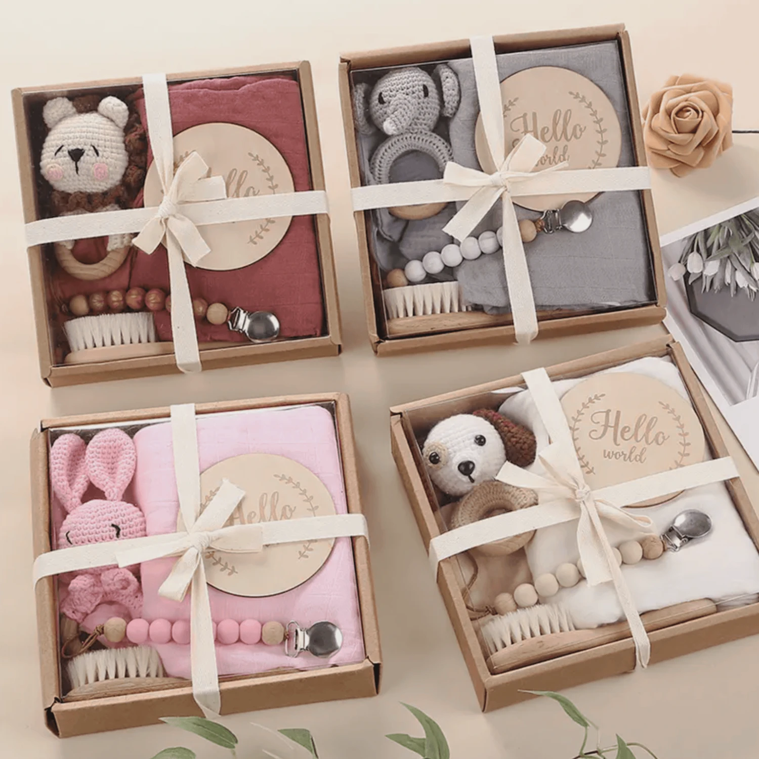 Introducing our charming 6-Piece Baby Gift Set, thoughtfully curated to delight both parents and their precious little one. This delightful ensemble includes everything a baby needs, beautifully presented in a rustic kraft box adorned with a clear lid and tied with a soft cotton ribbon.