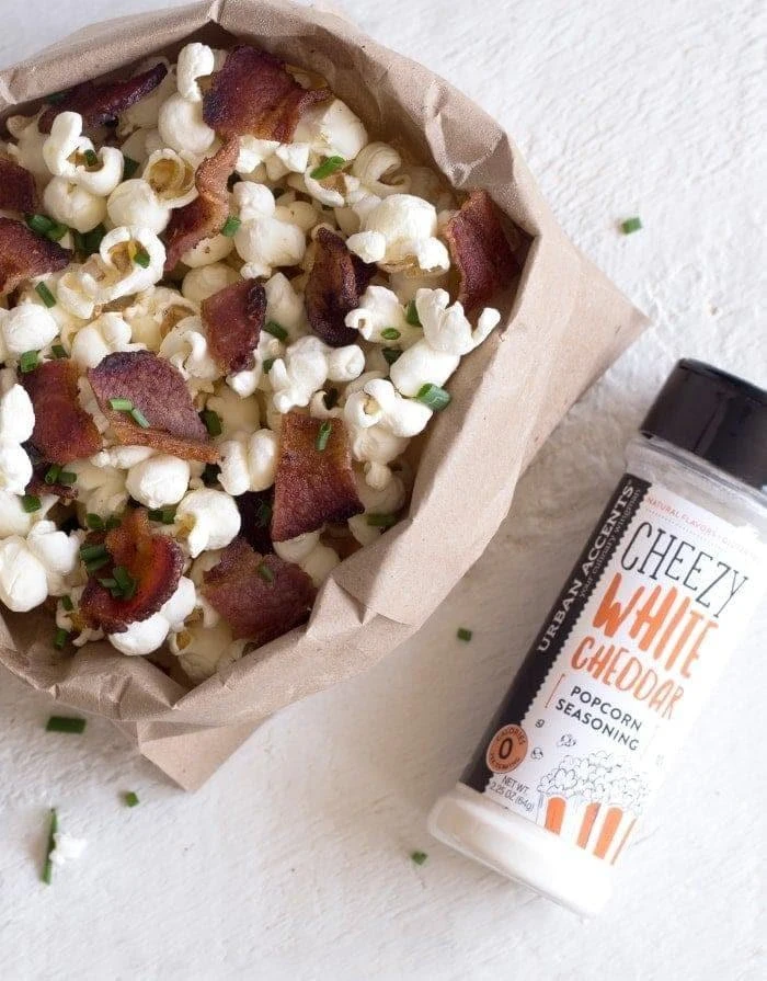 10 Cups popcorn, popped + 6 strips bacon, cooked & crumbled + 4 Tbsp butter, melted + 2 Tbsp White Cheddar Seasoning | combine butter & seasoning | pour over popcorn & bacon in large bowl & toss