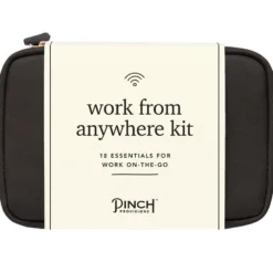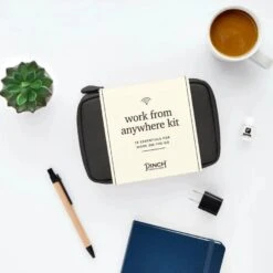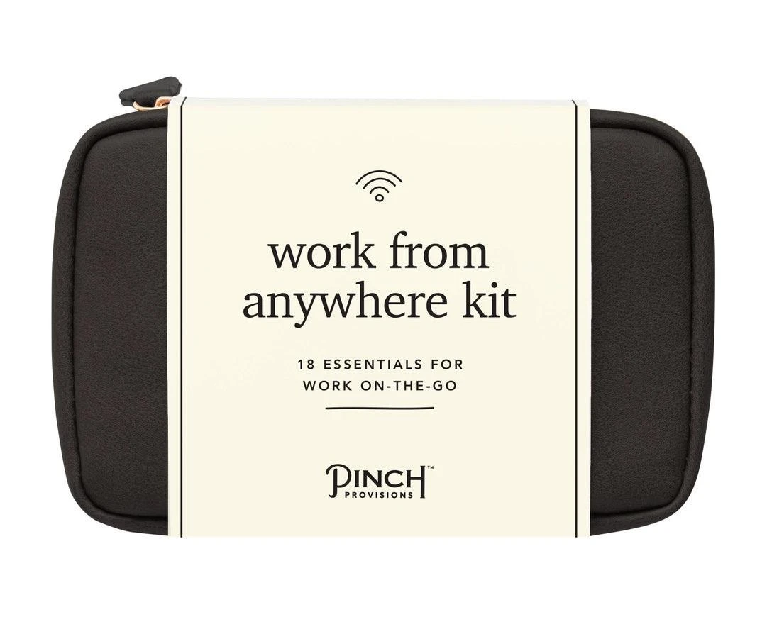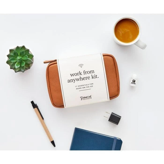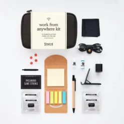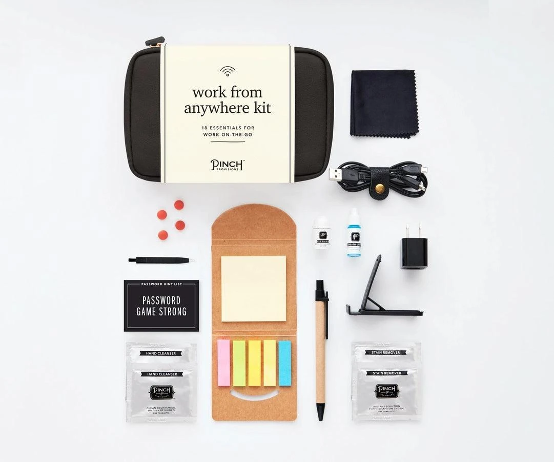 Our new Work From Anywhere Kit is a little tech, a little office, a little personal care, and a whole lot of convenience. The cognac vegan leather pouch with mesh zipper pockets contains 18 essentials: Notepad and sticky flags, pen, stain removing towelettes (2), microfiber cloth, phone/tablet stand, lip balm, breath drops, pain reliever (2), cord organizer, 2-in-1 charging cable, wall charger, cleaning tool, hand cleaning towelettes (2), and password hint list.